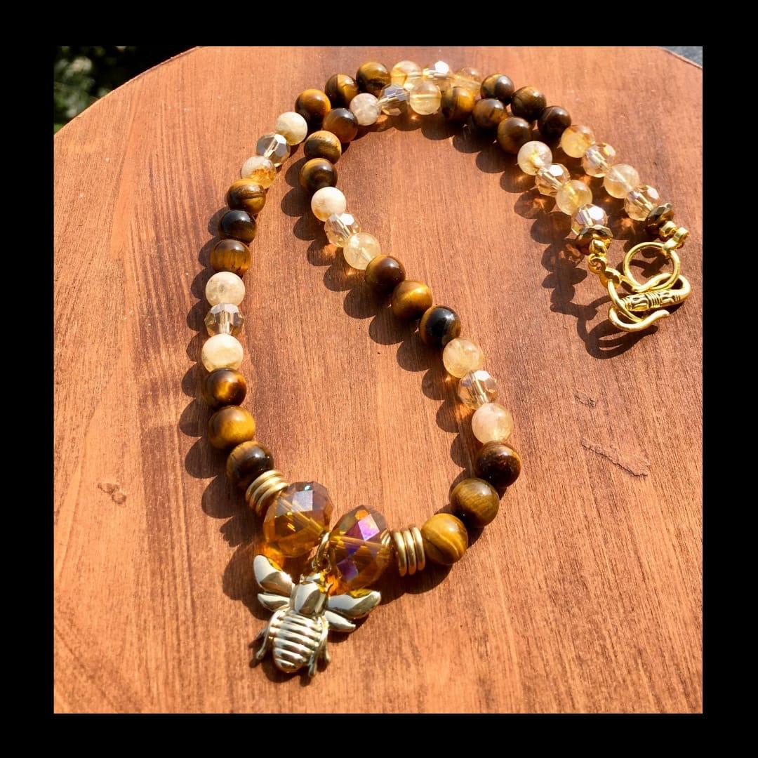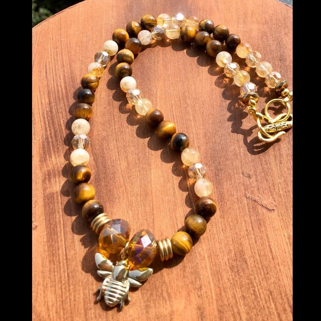 At the heart of this necklace lies a delicate, gold-plated honey bee pendant, symbolizing community, hard work, and the sweetness of life. The Citrine stones promote joy, positivity, and abundance, while the Tiger's Eye enhances courage, confidence, and mental clarity.