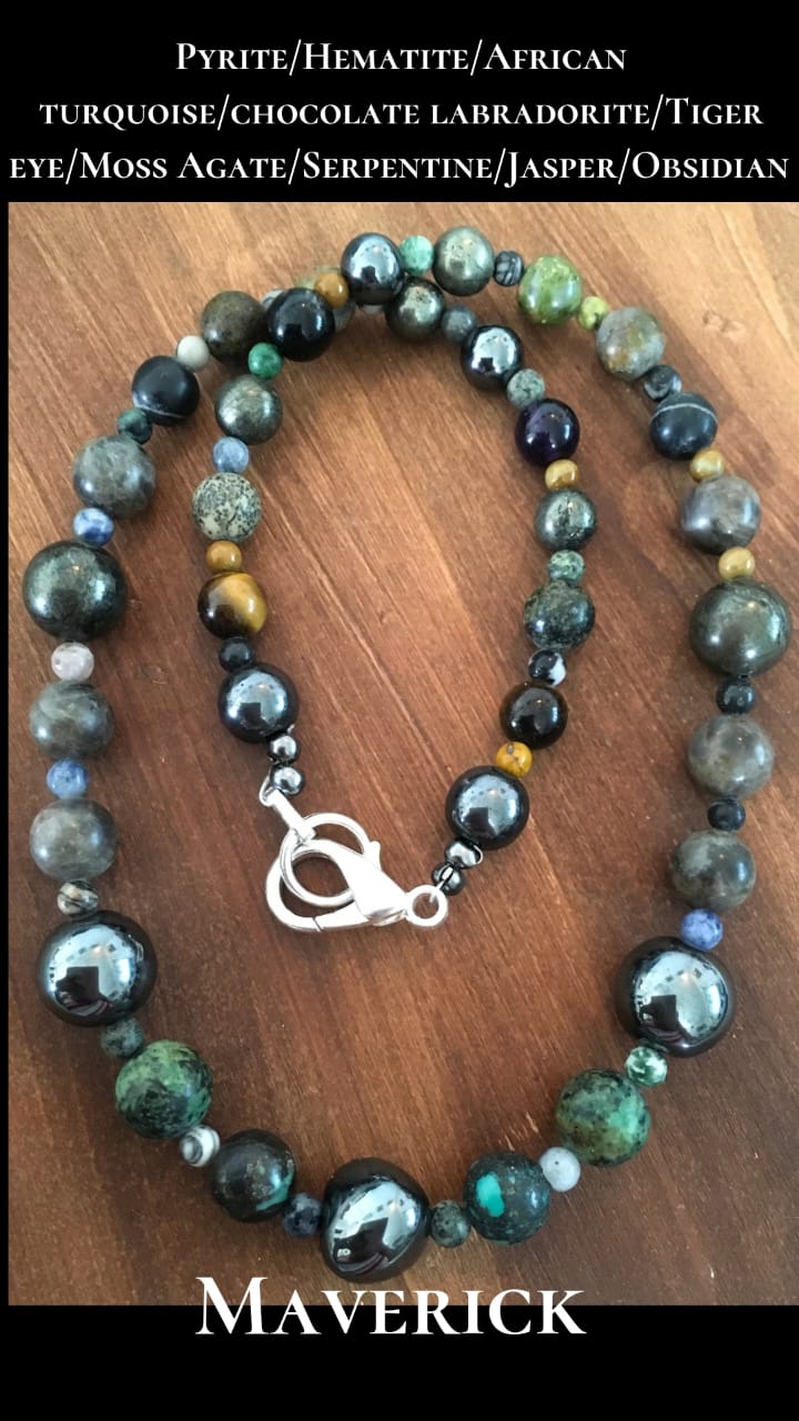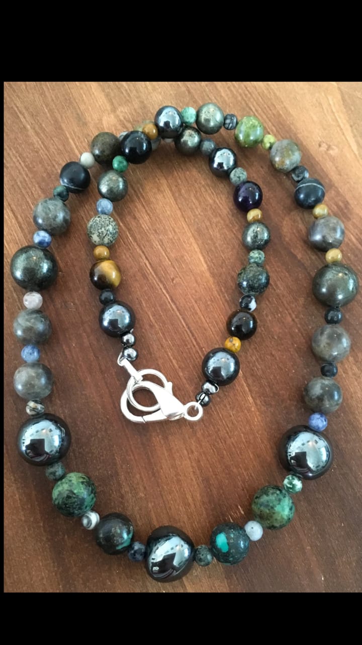 This unique necklace combines the earthy energies of Pyrite, Hematite, African Turquoise, Jasper, Moss Agate, Chocolate Labradorite, Tiger Eye, and Obsidian. Each crystal works in harmony to: